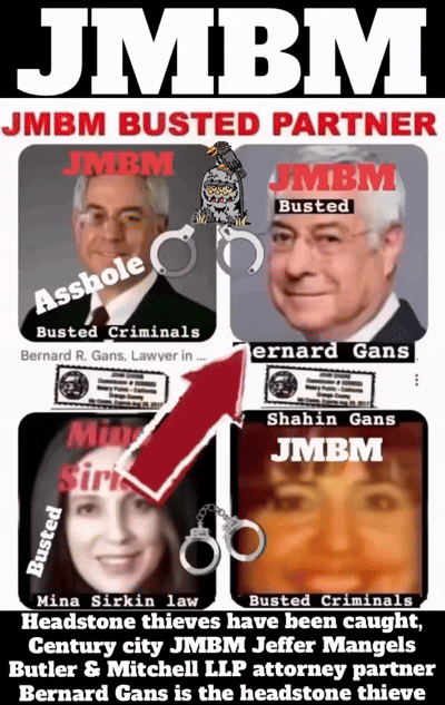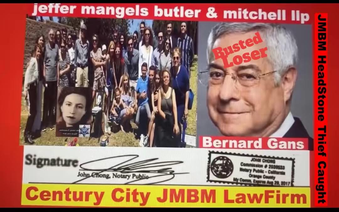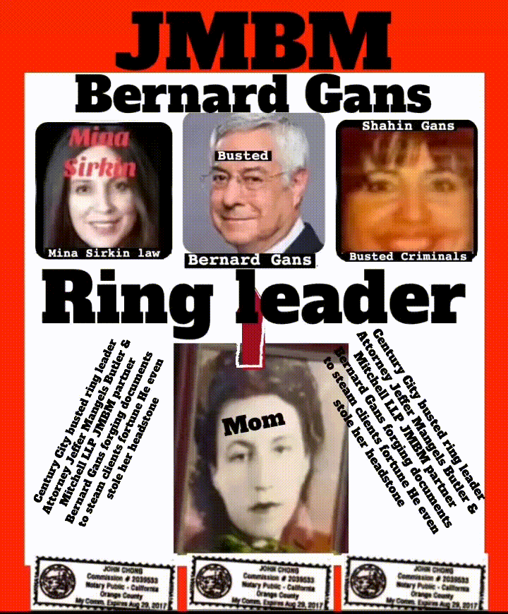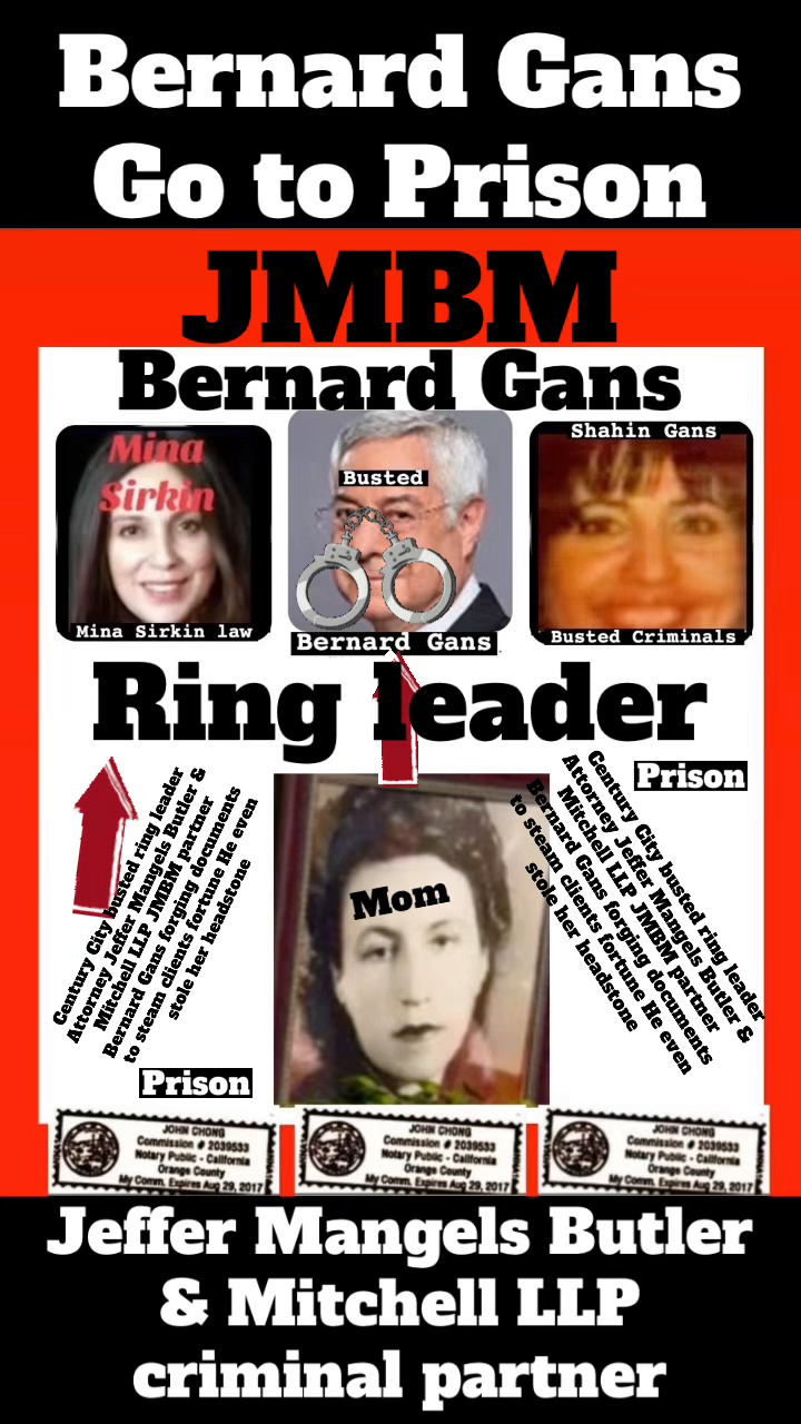 Suing JMBM partner $500,000,000,000.00 Busted criminal attorneys Jeffer Mangels Butler & Mitchell LLP lawyer Bernard Reginald Gans #57068 Bernard Gans Mina Sirkin law group JMBM killed my mom to get her fortune.Suing JMBM partner $500,000,000,000.00 Busted criminal attorneys Jeffer Mangels Butler & Mitchell LLP lawyer Bernard Reginald Gans #57068 Bernard Gans Mina Sirkin law group JMBM killed my mom to get her fortune..