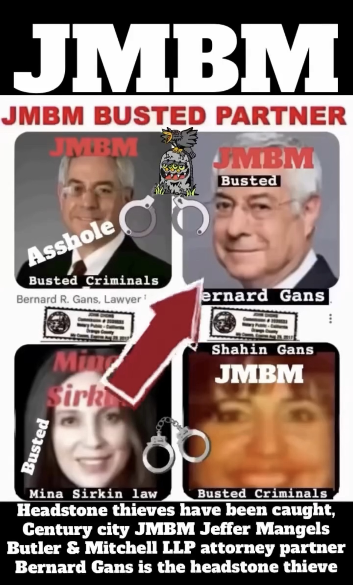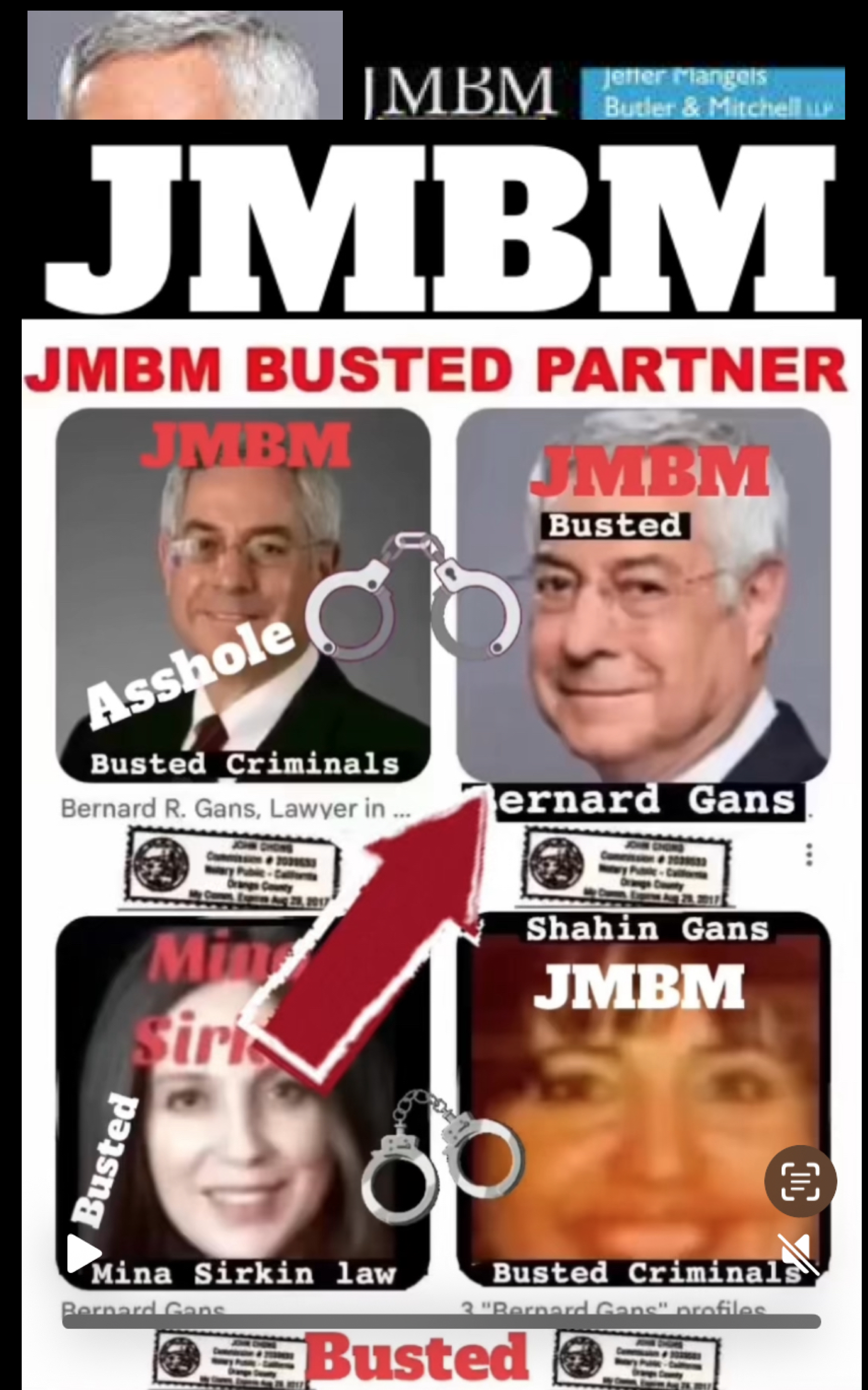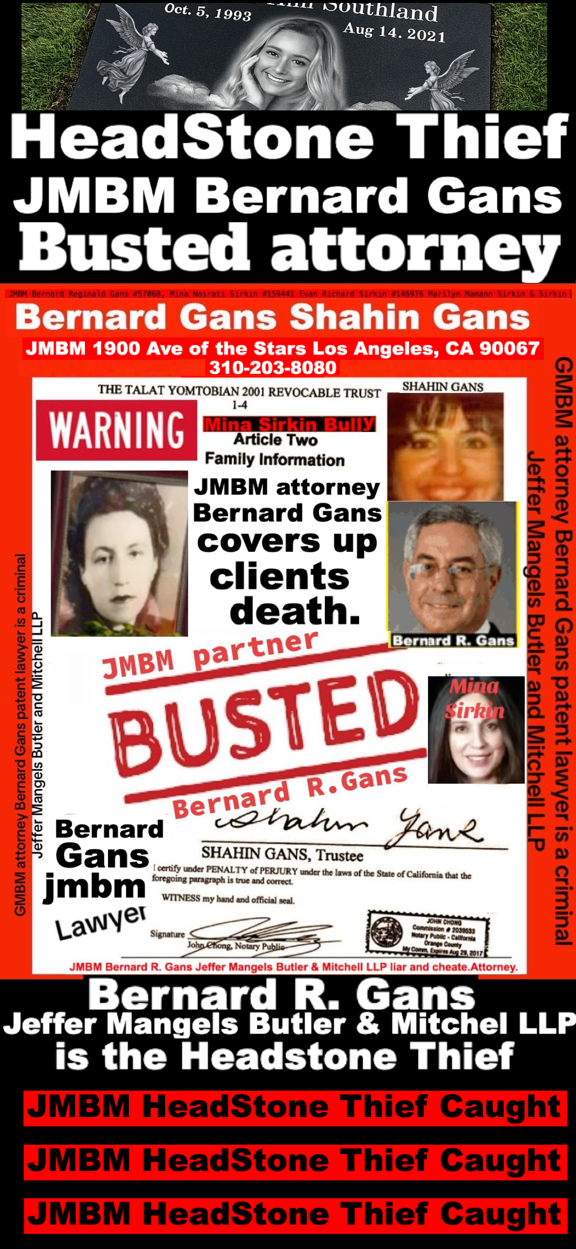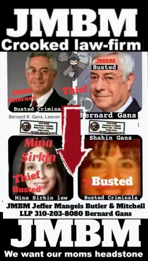 Suing JMBM partner $500,000,000,000.00 Busted criminal attorneys Jeffer Mangels Butler & Mitchell LLP lawyer Bernard Reginald Gans #57068 Bernard Gans Mina Sirkin law group JMBM killed my mom to get her fortune.Suing JMBM partner $500,000,000,000.00 Busted criminal attorneys Jeffer Mangels Butler & Mitchell LLP lawyer Bernard Reginald Gans #57068 Bernard Gans Mina Sirkin law group JMBM killed my mom to get her fortune.